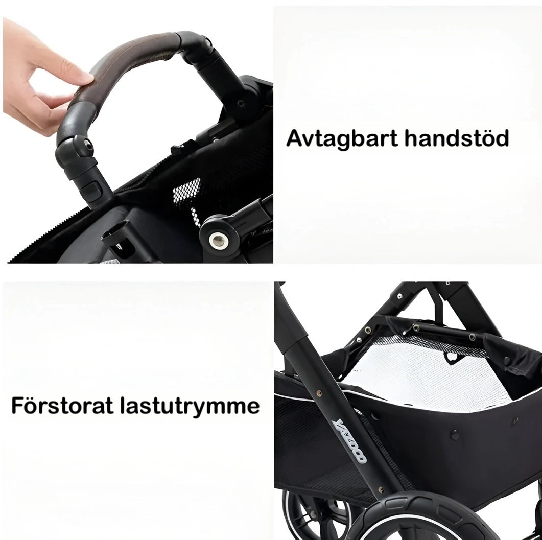 - Ergonomiskt handtag: Anpassningsbart efter förälderns längd.