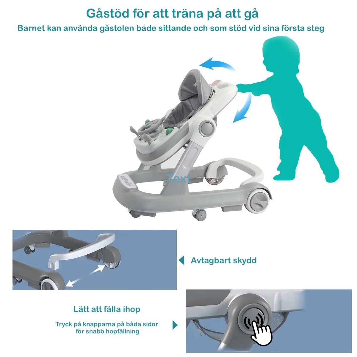 - 2-i-1 Design: Använd både som traditionell gåstol samt som gå-vagn för att stödja barnets utveckling.